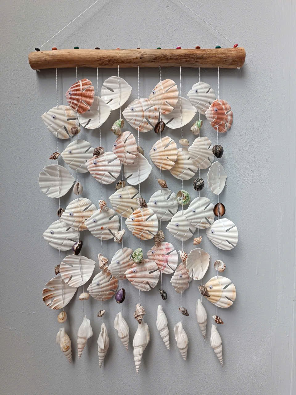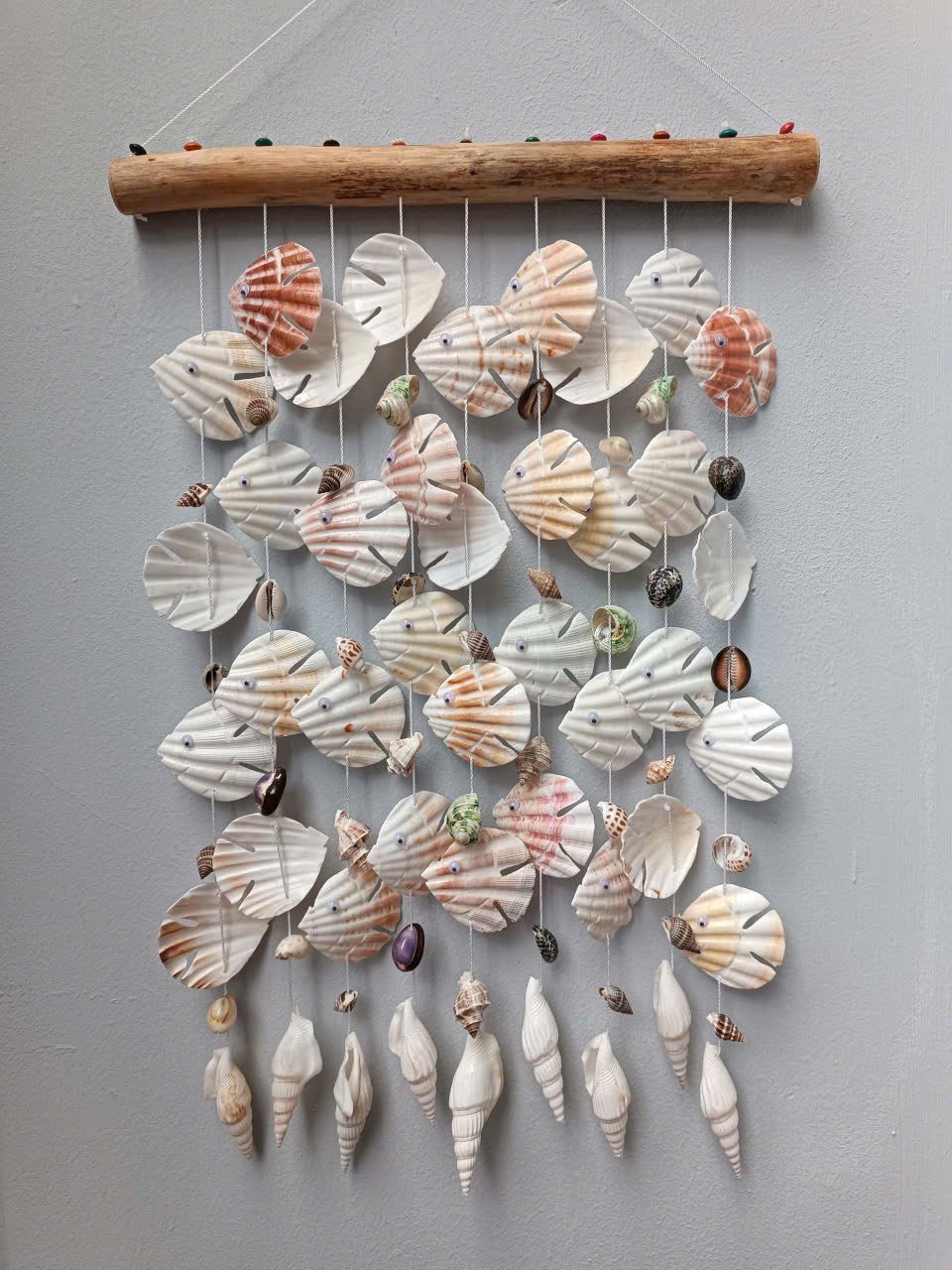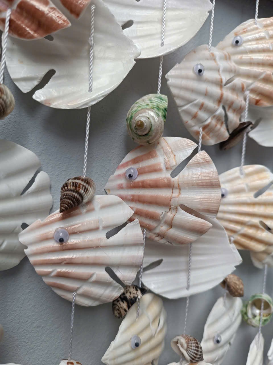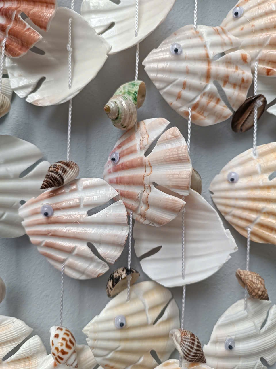 Phần thân cá được tạo nên từ những chiếc sò điệp lớn, có hoa văn cánh quạt và màu sắc nhẹ nhàng như trắng kem, hồng nhạt và vàng cát. Từ thân cá, các sợi dây treo được xâu bằng nhiều loại vỏ ốc mini được sắp xếp xen kẽ khéo léo, tạo nên bố cục mềm mại và sống động.