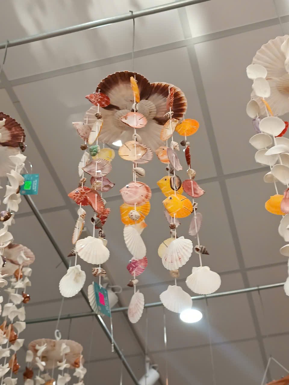 Từ thân cá, những dây treo được kết nối khéo léo bằng chỉ cước hoặc dây gai, điểm xuyết bởi các loại vỏ ốc nhỏ như ốc giác, ốc xà cừ, sò lông, sò điệp mini… tạo nên tổng thể hài hòa và mềm mại.