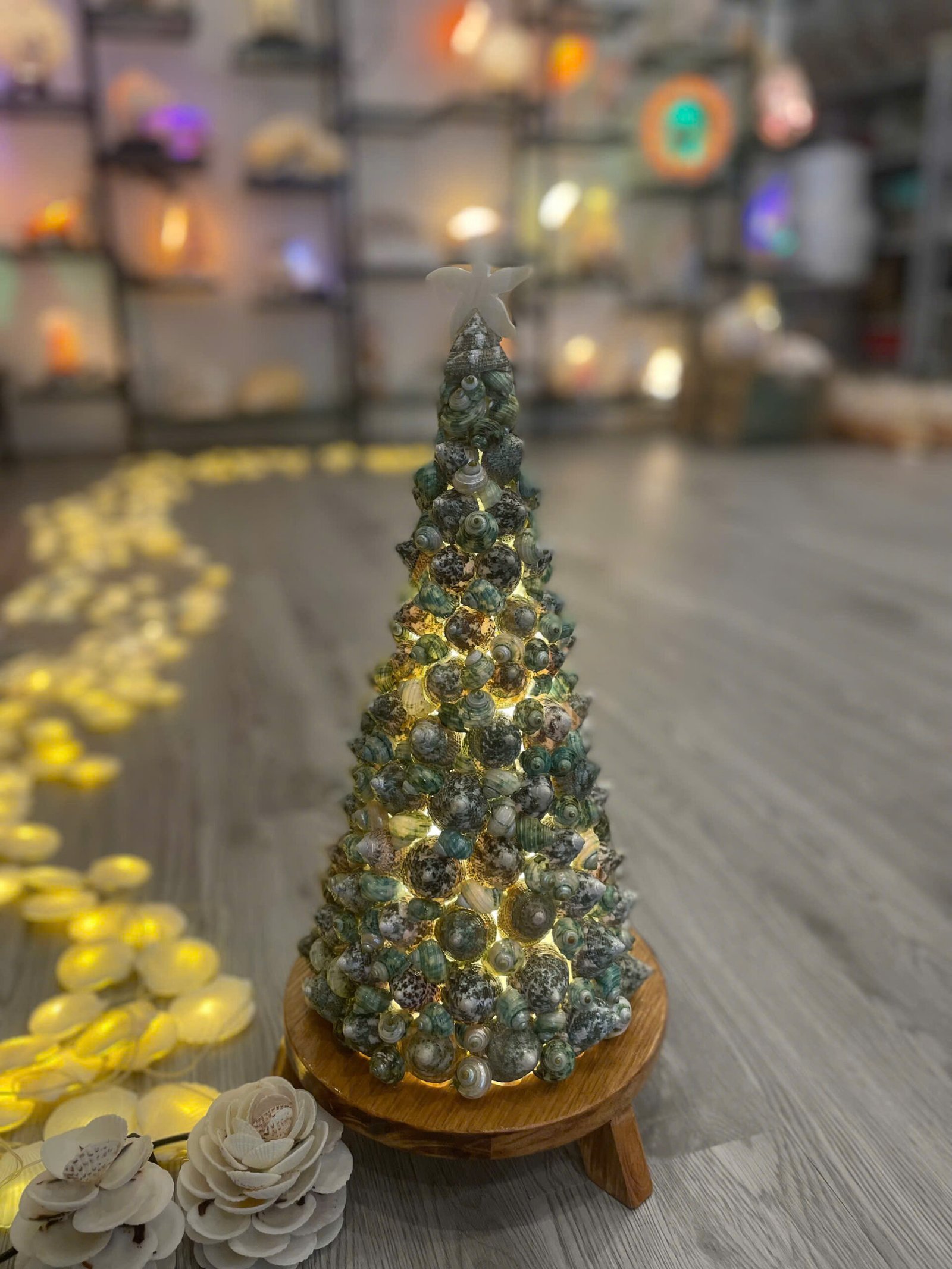 Dáng cây thông nhiều tầng được xếp bằng vỏ sò, tạo nên một bố cục vừa hài hòa vừa nghệ thuật. Phần thân đèn và các chi tiết được xử lý cẩn thận để đảm bảo: