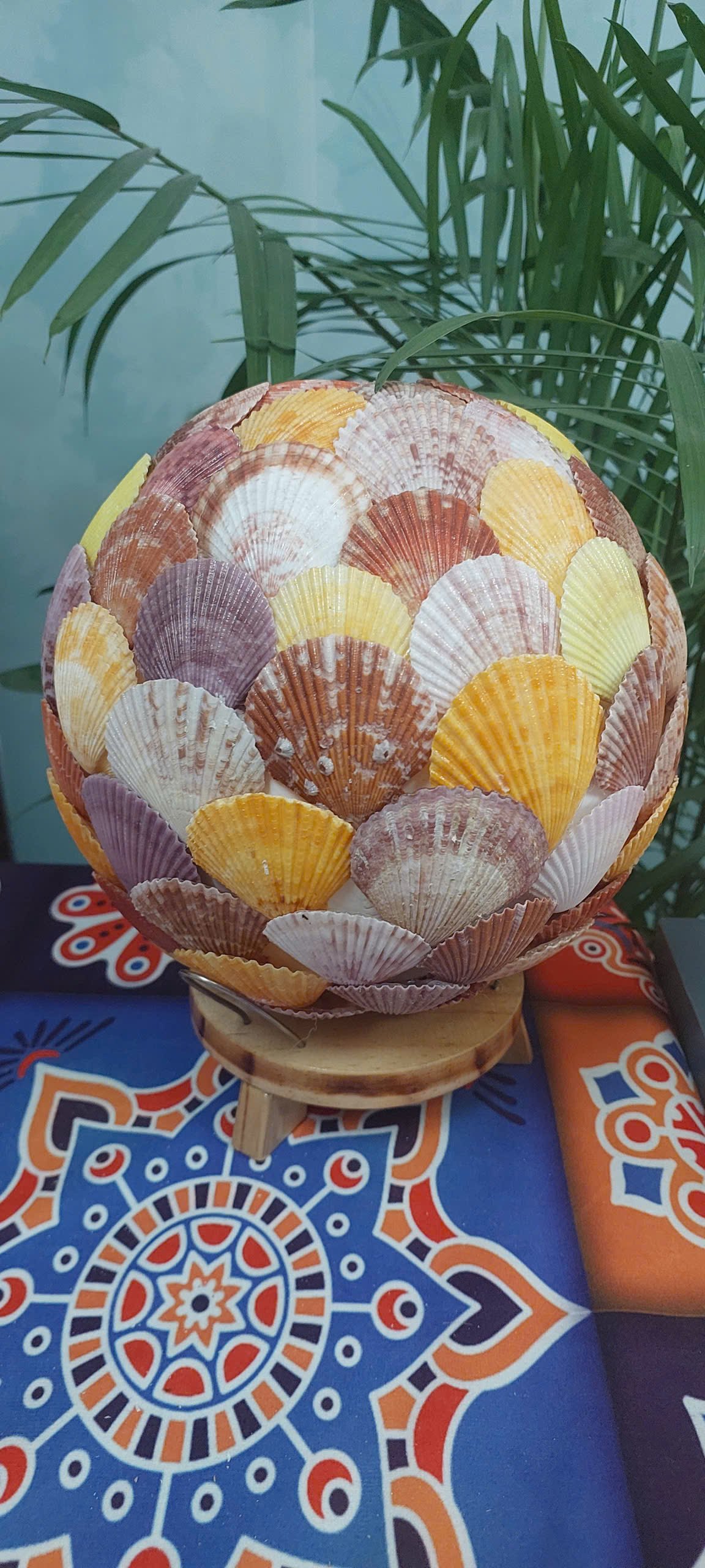 Mỗi cánh sò là một gam màu của biển, được xếp tay tỉ mỉ để tạo nên quả cầu ánh sáng độc đáo.